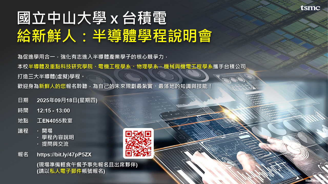 三、敬請事先報名,現場準備輕食午餐予事先報名且出席夥伴,活動詳情及注意事項請參閱台積電網站活動公告。