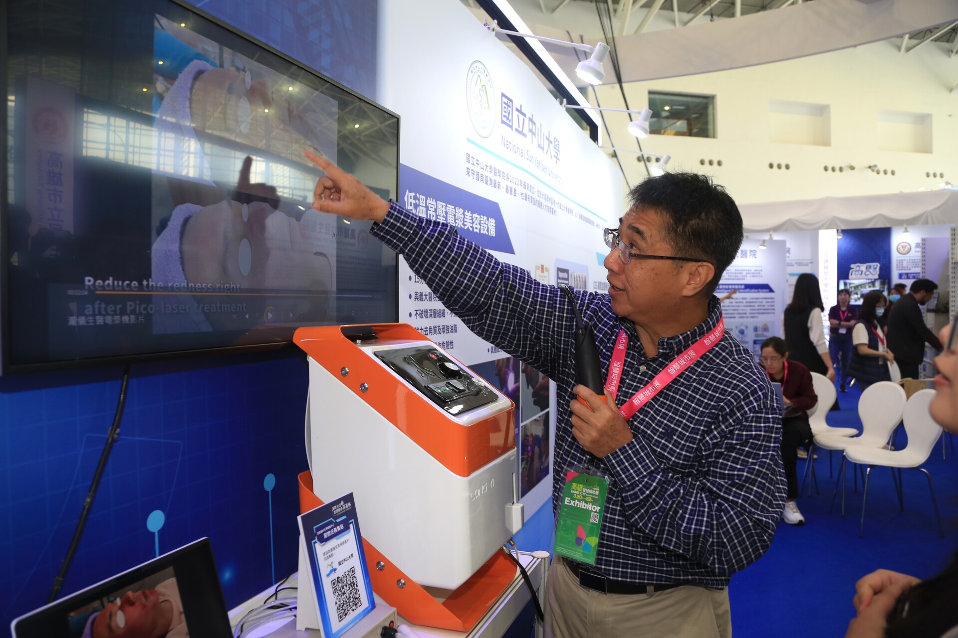 高雄智慧城市展今(20)盛大登場,國立中山大學為「智慧醫療主題館」唯一參展的大專院校,展現穩健的研發成果。本系主任林哲信教授帶領團隊,歷經20年投入,成功研發「大面積餘暉放電冷電漿」系統。